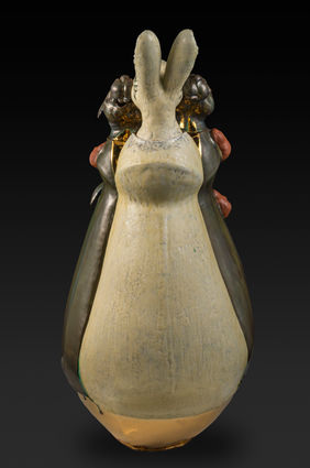 Custom red clay, slip palette and satin glaze formulated by artist, commercial underglaze, and 23 carat gold luster